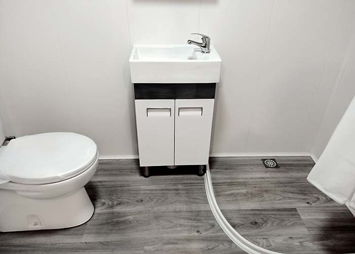 Completando a experiência de viver, a Munich Tiny House dispõe de uma casa de banho bem concebida e equipada com acessórios essenciais.O banheiro proporciona funcionalidade sem comprometer o estilo, criando um espaço confortável e refrescante.
