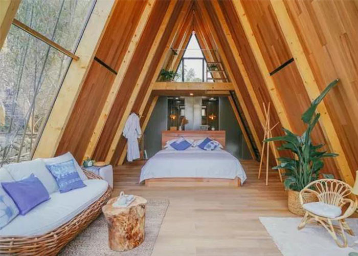 Esta casa de madeira triangular tem uma forma triangular única. A janela de vidro do chão faz toda a sala brilhante e bem iluminada. Mesas e cadeiras são colocadas no convés aberto, e a janela de vidro do chão é muito brilhante.que é adequado para sentar lá depois do jantarTem uma cozinha, uma casa de banho, um quarto e uma sala.que é mais adequado para projetos de alojamento e hotéis na zona turística cênicaTambém pode ser feito para uma casa particular.