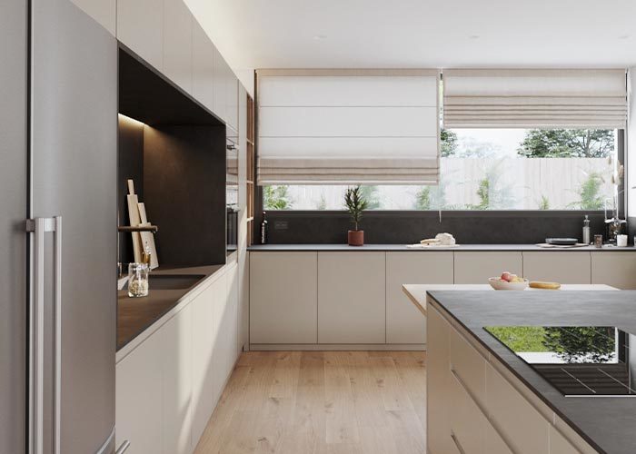 Este bungalow em forma de L, cuidadosamente concebido, oferece fluxo contínuo e uma vida prática.